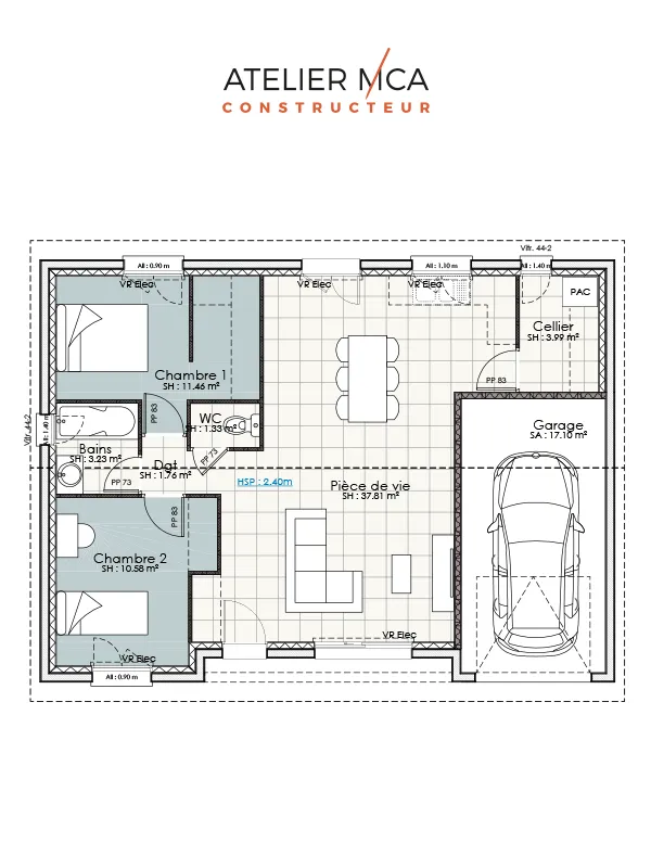 Pensée pour les terrains situés dans le Rhône et la métropole lyonnaise, elle privilégie une architecture ouverte, lumineuse et fluide. Son organisation de plain-pied favorise une circulation naturelle entre les espaces et crée une véritable continuité entre intérieur et extérieur, dans un esprit de simplicité maîtrisée.